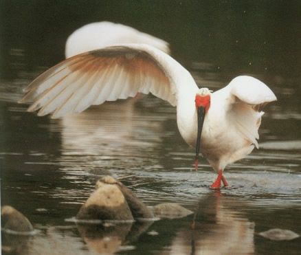 全長79厘米左右體重約1.8千克。雌雄羽色相近體羽白色羽基微染粉紅色。后枕部有長的柳葉形羽冠;額至面頰部皮膚裸露呈鮮紅色。初級飛羽基部粉紅色較濃。嘴細長而未端下彎長約18厘米黑褐色具紅端。腿長約9厘米朱紅色。