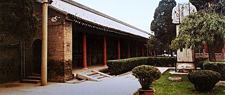 西安孔廟唐時在尚書省西隅國子監附近。宋代幾經搬遷崇寧二年(1103)虞策將文廟、府學最終遷建于“府城之東南隅”即西安碑林博物館現址使文廟、碑林、府學同在一處。據《京兆府重修府學記》碑載這時的文廟:“總五百楹宏模廓度偉冠一時”。隨著時代的變遷孔廟現保留的多是明清時期的建筑。明成化十一年(1475)《重修西安府學文廟記》云:“擴其舊址首建大成殿七間崇四丈有五、深五丈袤九丈有二。兩廡各三十間崇深視殿半之袤且數倍。次作戟門又次欞星門又次文昌祠七賢祠、神廚、齋宿房、泮池……。”加之明萬歷二十年(1592)增建的“太和元氣坊”及清代構建的七座碑亭基本上構成了今日西安孔廟的建筑格局。其中孔廟最主要的建筑大成殿是一座宏偉的明代廡殿式建筑可惜于1959年毀于雷火。貫穿于中軸線上的孔廟其它建筑如兩廡、戟門、欞星門、泮水橋、太和元氣坊、碑亭等建筑至今還保存完好。其中的戟門面闊三間進深兩間單檐歇山頂上鋪綠色琉璃瓦仍保持著明代建筑的顯著特征。