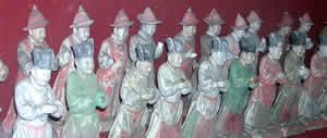 這個(gè)龐大的儀仗隊(duì)是從明朝開國(guó)皇帝朱元璋的兒子朱擷墓出土的從中可以看到職務(wù)不同身份各異的不同服飾。中國(guó)的陶俑藝術(shù)唐代以后逐漸衰落過去認(rèn)為到明代已基本結(jié)束這一大俑群的發(fā)現(xiàn)填補(bǔ)上中國(guó)藝術(shù)史上的一大空白。