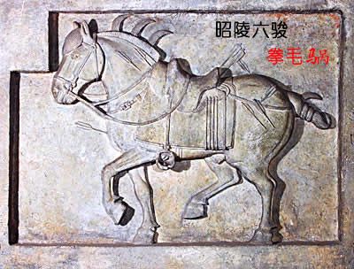“拳毛騧”是李世民武德四年十二月至次年三月平定河北與劉黑闥(原竇建德部將)在沼水(即漳水在今河北省曲周縣境內(nèi))作戰(zhàn)時(shí)所乘的一匹戰(zhàn)馬列于祭壇西側(cè)三駿石刻中間。馬黑嘴頭周身旋毛呈黃色原名“洛仁騧”是代州(今河北代縣)刺史許洛仁在武牢關(guān)前進(jìn)獻(xiàn)給李世民的坐騎故曾以許洛仁的名字作馬名。許洛仁死后陪葬昭陵其墓碑上就記載著武牢關(guān)進(jìn)馬之事 (見《昭陵碑石》《許洛仁碑》三秦出版社1993年版)。后人或因馬周身旋毛卷曲又稱“拳毛騧”。一般認(rèn)為馬身若有旋毛是賤丑的但此馬矯健善走蹄大快程貴不嫌丑故用“拳毛”作馬名以表彰唐太宗不計(jì)毛色不嫌其丑善識(shí)駿馬的眼光。葛承雍先生研究認(rèn)為 “拳毛”音源于突厥文“khowarkho”漢文在《北史》中稱為“權(quán)于麾國”在隋唐古音中語音對譯極為類似。所以“拳毛”的標(biāo)準(zhǔn)譯名應(yīng)源于“權(quán)于麾”。由此可見“拳毛騧’可能是從“權(quán)于麾國”來的或者是一匹與“權(quán)于麾國”種馬通過人工雜交方式培養(yǎng)出來的大良馬。