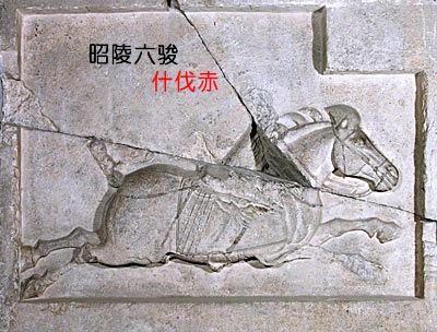 “什伐赤”是一匹純赤色駿馬排列于祭壇東側末位。關于 “什伐赤”的名稱日本學者原田淑人認為:“什伐”或譯作“叱撥”是波斯語“阿濕婆”的縮譯即漢語“馬”的意思(見原田毅人《東亞文化研究》東京座右寶刊會1944年版)。按原田淑人的說法這匹馬是用波斯語命名那么“什伐赤”和“桃花叱撥價最殊”(岑參詩句)、“紫陌亂嘶紅叱撥”(韋莊詩句)中的“叱撥” 馬都應是來自西域波斯(今伊朗)的名馬。美國學者費賴伊 R·N.Frye)研究指出“叱撥”是粟特人主要用來對馬的稱呼。祭鴻生先生論證后也認為“叱撥”或“什伐赤”均為大宛的汗血馬 (蔡鴻生《唐代汗血馬“叱撥”考》見《唐代九姓胡與突厥文化》甲華書局1998年版)。葛承雍先生研究認為“什伐赤”是用突厥官號命名的一匹坐騎。他認為“什伐”來自突厥語應對音轉譯為漢文“設發”而“設”又有“殺”、“察”、“沙”等異譯。據(通典.突厥上》注釋和《舊唐書.突厥傳》等文獻記載“設’’是突厥別部領兵的將領。任“設’’者都是可汗的直系親屬即所謂“常以可汗子弟及宗族為之”(《通典·突厥下》卷197)地位在可汗、葉護之下可以建立牙帳率領精銳兵馬二萬人左右專制一方。盡管學術界對“設發”的對譯與含義有許多不同觀點但大家都公認“設發”或“設”、“失”等是突厥的高級官號。因此“什伐” 就是“設發”(或失發)的異譯昭陵六駿之“什伐赤”當是用突厥官號命名的一匹坐騎(葛承雍《唐昭陵六駿與突厥葬俗研究》《中華文史論叢》第60輯)。