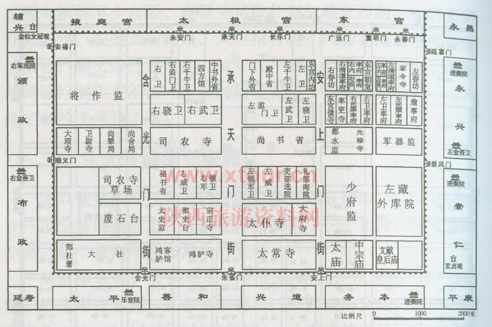皇城緊附宮城之南,面積約5.2平方千米,南北七條大街,東西五條街。承天門街把皇城分為東西兩半,所有建筑物也是以它為中心東西對稱布設。承天門大街東西兩側從北到南,東邊有東朝堂,西邊有西朝堂;東邊有門下外省,西邊有中書外省;東邊有左武衛,西邊有右武衛;東邊有尚書省,西迥自司農寺;東邊有左領軍衛,西邊有右領軍衛;東邊有太仆寺,西邊有宗正寺;東邊有太常寺,西邊有鴻臚寺等。至于皇城內安上門街東和含光門街西,由于布設的機關不大重要,故并未完全遵守東西對稱的原則。 現存的西安古城墻系明代初年將唐長安城的皇城和部分太極宮東擴建筑而成。 隋唐是我國歷史上宗教發展的興盛時期,長安城是全國宗教活動的中心,長安城宗教林立,不僅有本土的道教,還有自漢從印度傳入的佛教,南北朝至唐代從波斯傳入的襖教、景教、摩尼教等, 佛教在唐朝有很大的發展。其中以佛教、道教最為興盛,其佛教傳播之廣不僅在國內,而且對國外也產生了一定影響,尤其對當時的日本佛教界影響極大。 |