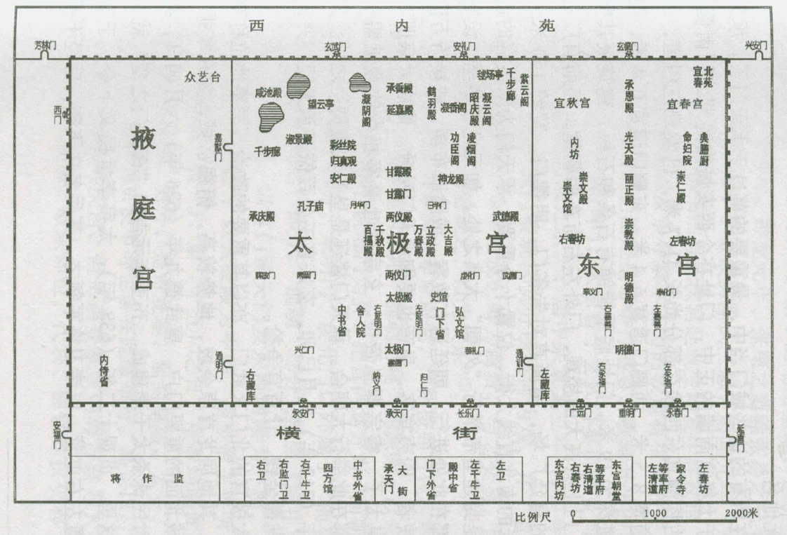 西內太極宮 太極宮建于隋初。隋稱大興宮,唐睿宗景云元年(710年),改稱太極宮。因其為唐京的正宮,故又稱京大內。唐太極宮實際上是太極宮、東宮、掖庭宮的總稱,位于唐長安城中央的最北部。據考古實測并參考文獻記載可知,宮城東西寬2830.3米,南北長1492.1米。其中掖庭宮寬。702.5米,太極宮寬1285米,東宮寬832.3米,是一東西長,南北短的長方形。宮城的北墻即是外郭城的北墻的一部分,西墻則與今西安城的西城墻在同一直線上,其南段為西安城西墻的北部所壓;南墻則在今西安城內西五路以南80米處,今之“西五臺”恰在宮城南墻之上;東墻的位置在今西安城內革命公園的西端,向北經尚平路一帶。宮城南面隔橫街與皇城相望,北面為'西內苑,東墻外為興安門街,西墻外為芳林門街,宮城中太極宮、東宮、掖庭官南北宮墻長度“相齊”,即南北宮墻長度相同。