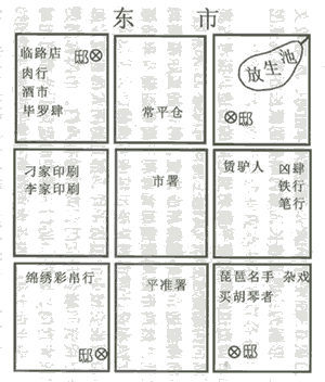 唐長安的東市和西市跟里坊一樣,四周皆有高大的圍墻,宋敏求《長安志》等記載其規(guī)模相當(dāng)龐大,每個(gè)市約占2個(gè)坊的面積,市內(nèi)有4條大街,圍墻四面各有2個(gè)門,這在對兩市遺址進(jìn)行全面勘察與測量時(shí)得到證實(shí)。"作為長安城乃至全國最主要的市場,西市進(jìn)行的是封閉式的集中交易,也就是將若干個(gè)同類的商品聚集起來,以'肆'(或相當(dāng)?shù)?行'、'店')為單位組成的,市內(nèi)設(shè)有專門的管理機(jī)構(gòu)--市局和平準(zhǔn)局。交易區(qū)也都是集中在一個(gè)四面有墻、開設(shè)市門的較為封閉的場所內(nèi)。"