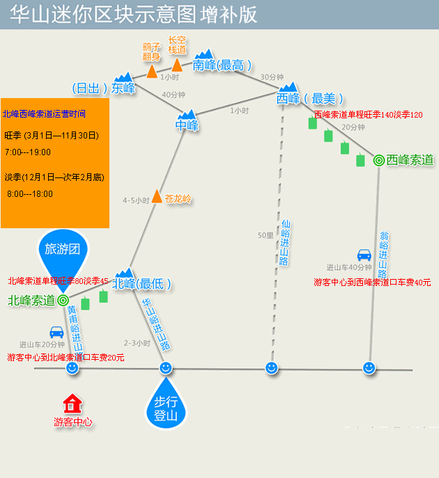傳統路線步行上山至北峰,約四個小時左右;從北峰步行下智取華山道,約2小時,下傳統路線3小時左右.